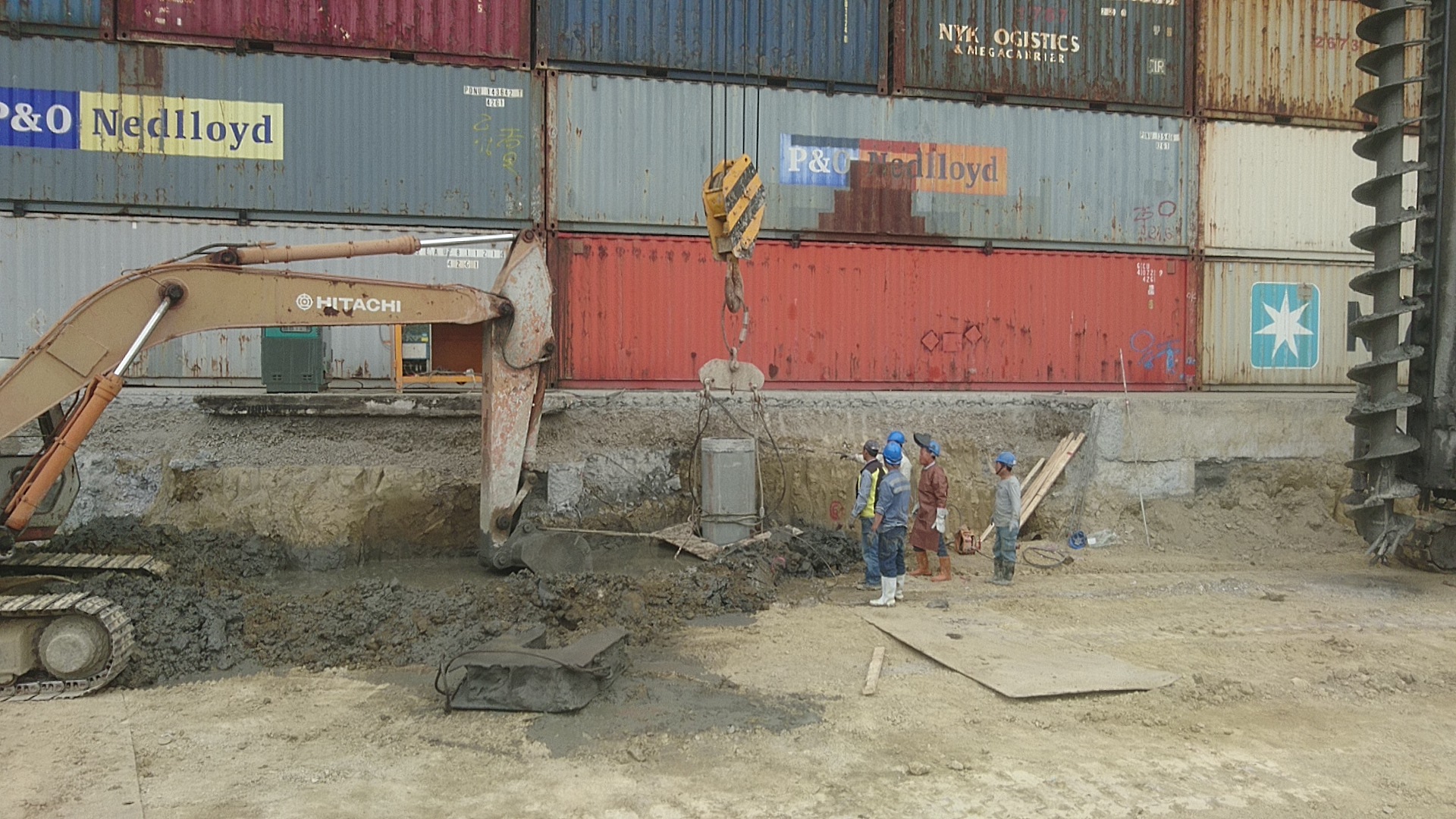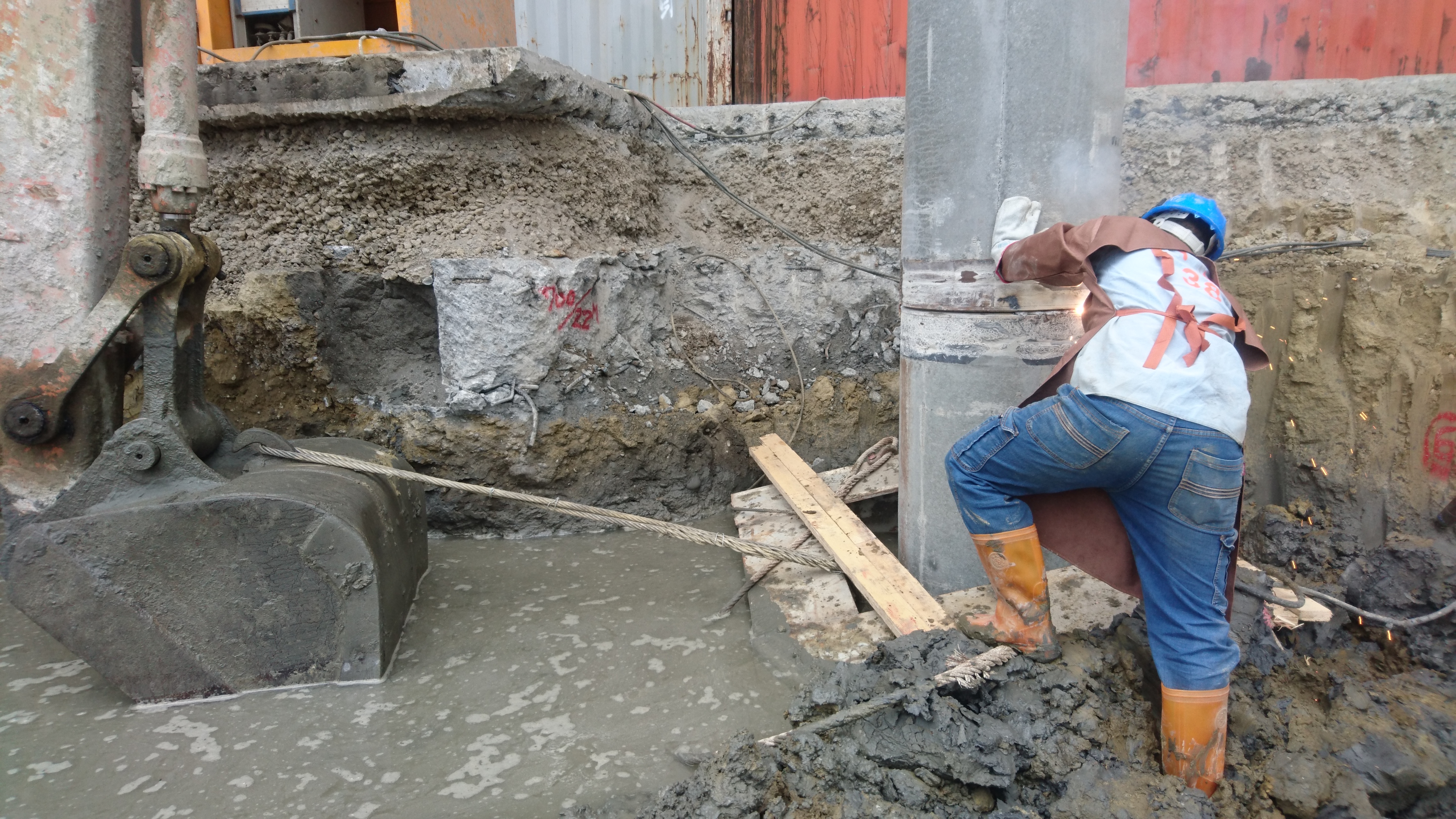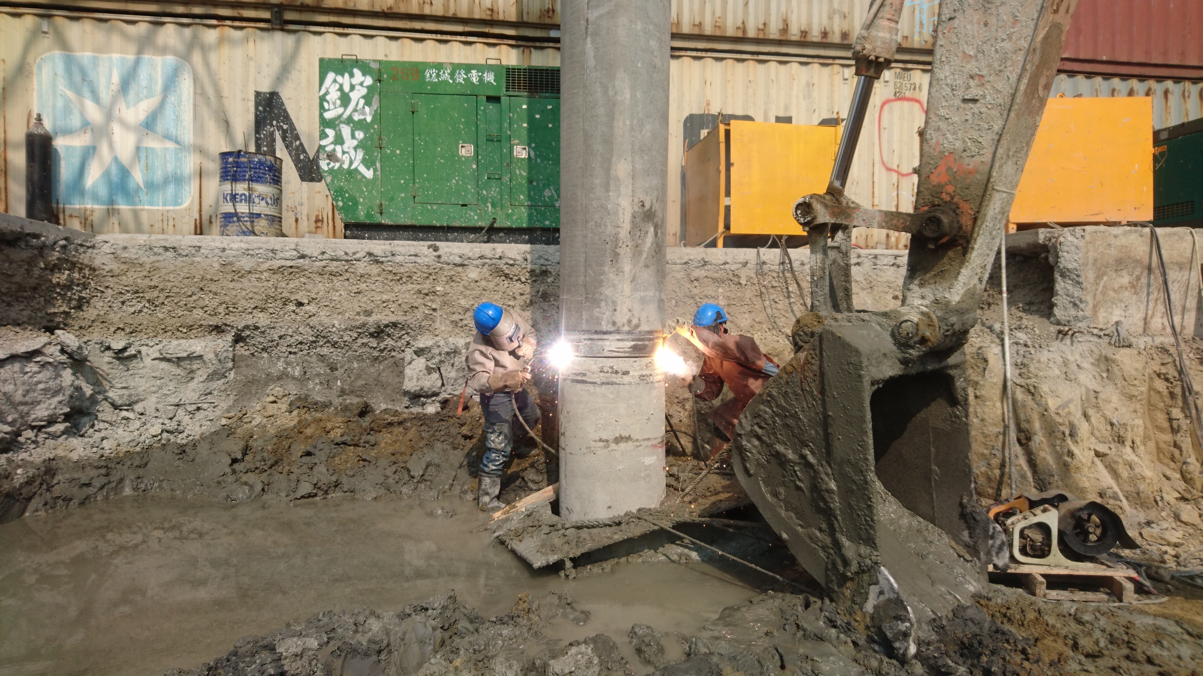 ↑銲接工作:若銲接時間過長,會導致銲接完無法下樁至設計高程之風險。原因為孔壁裡之水泥漿沉滯孔底,迫使預鑽孔底高程上升,深度減少。