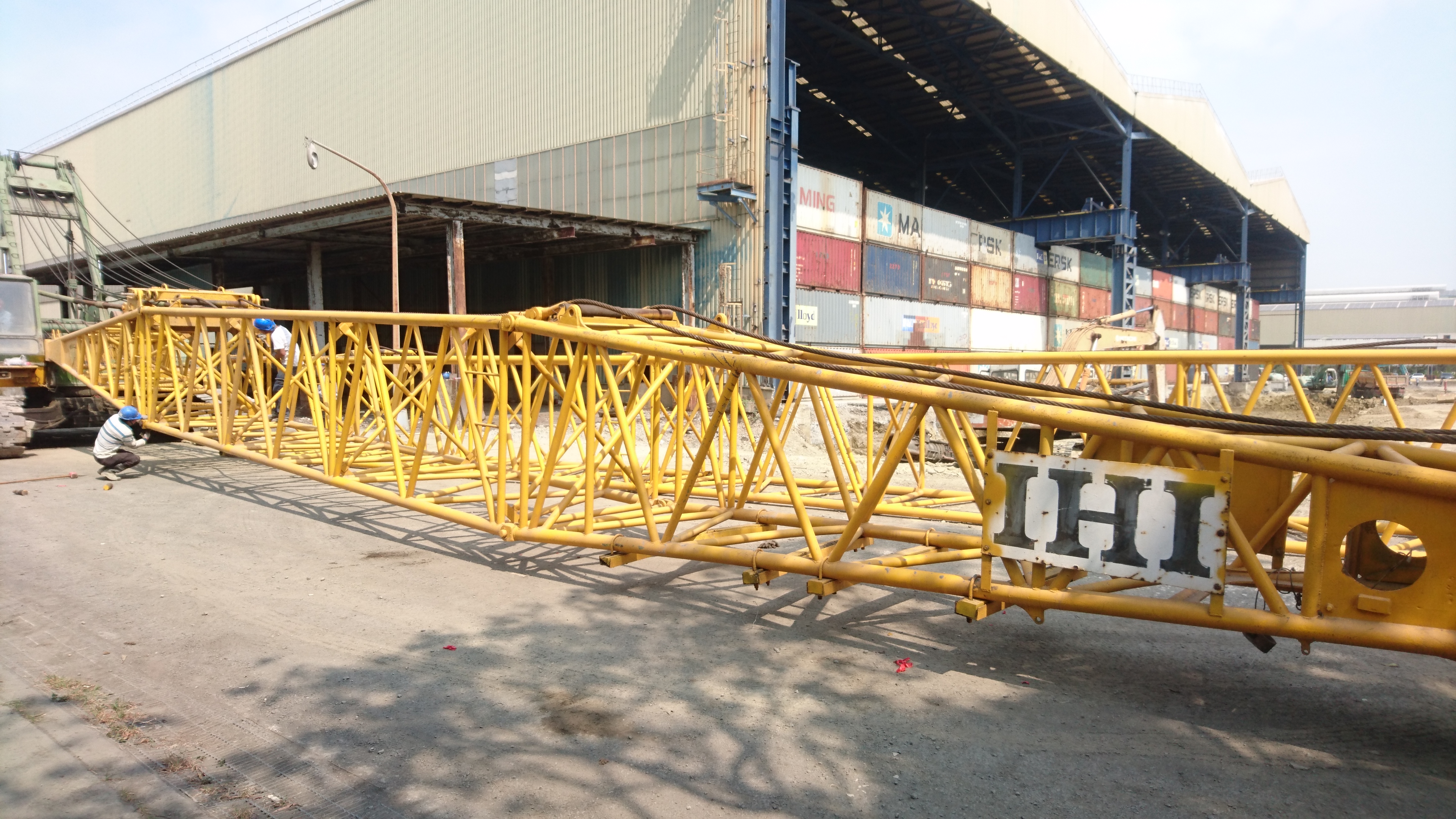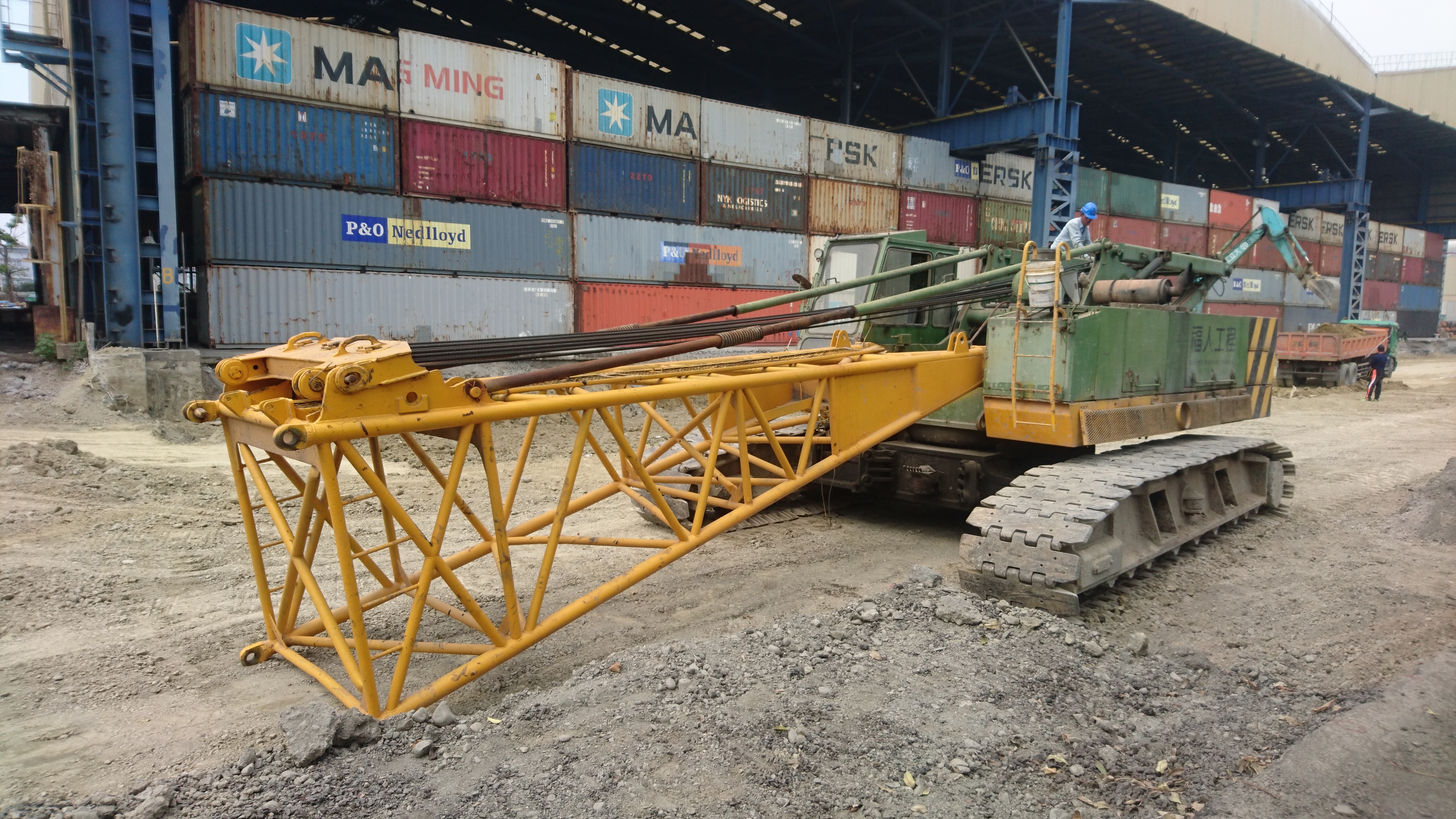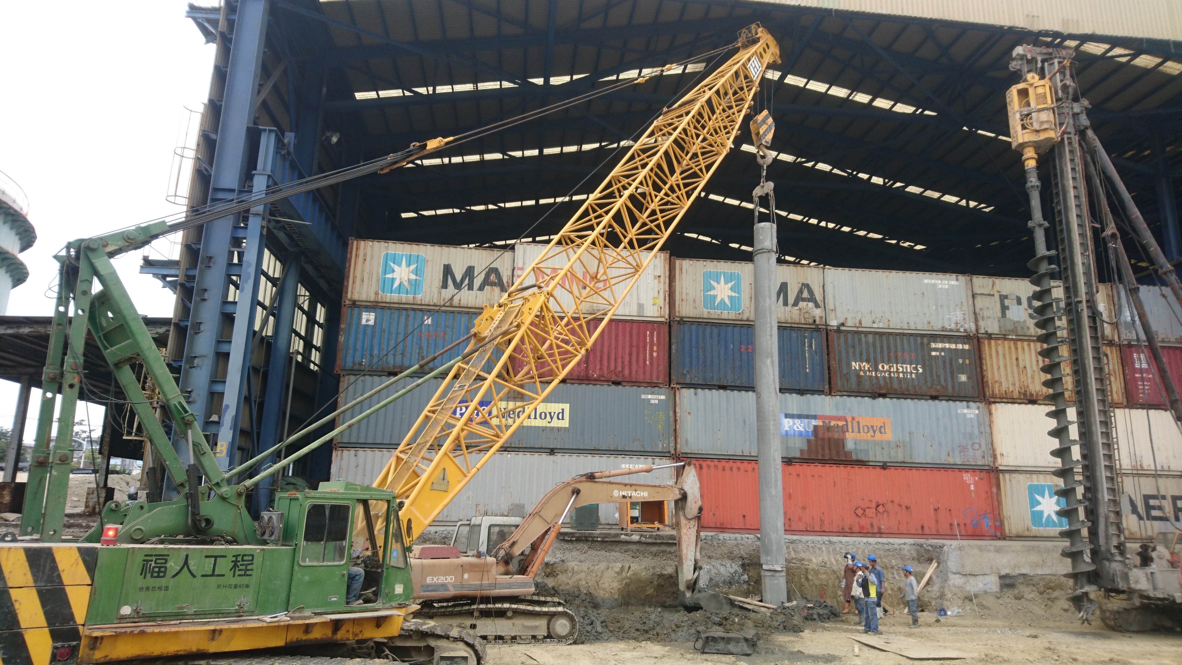 ↑吊車組立中:為配合工期,先施作∮50cmPC基樁。完工後再加長桁架以吊掛∮60cm、∮70cmPC基樁,多一次拆機組機的成本時間。