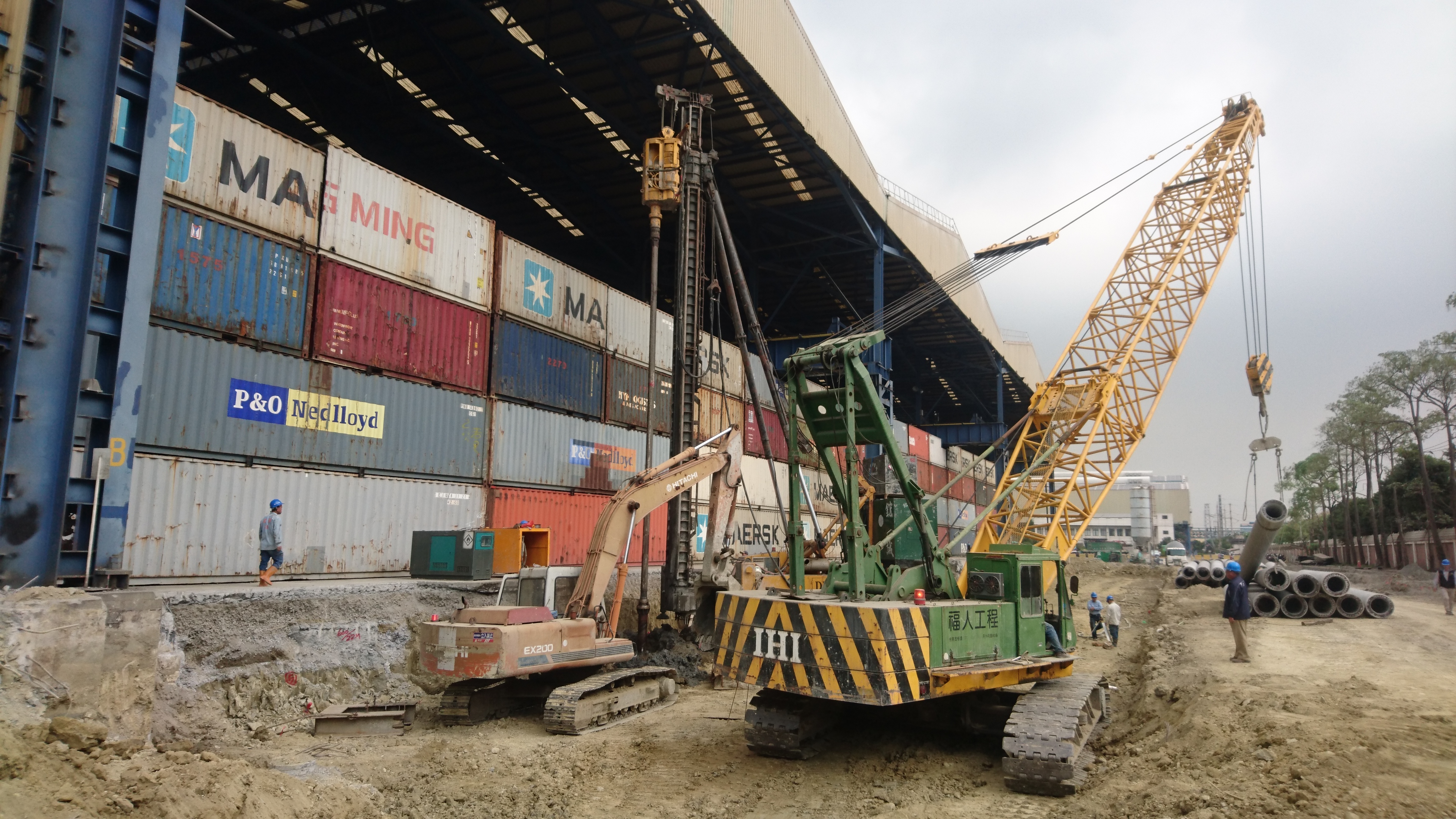 ↑∮50cm×12mPC基樁施工,鑽掘機鑽孔至設計深度,注漿穩定孔壁。